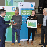 À Gueugnon (71), Jean-Pierre Morvan, directeur régional Allier-Loire amont de l'agence de l'eau a remis un trophée de l'eau à Jean-Marc Guilhem, président du Syndicat mixte des bassins versants de l'Arroux et de la Somme (SMBVAS), pour l'action de concertation et de mobilisation du syndicat face aux effet du dérèglement climatique sur son territoire.