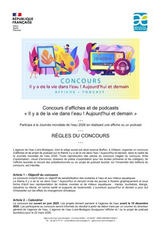 Envoyez vos projets d’affiches ou podcasts jusqu'au 19 décembre 2025. Concours ouvert de la maternelle au lycée dans le bassin Loire-Bretagne. L'agence de l'eau Loire-Bretagne vous invite à célébrer la journée mondiale de l’eau 2026, en explorant de façon sensible et artistique, le thème de l'eau et des milieux aquatiques dans le cadre de l’adaptation au changement climatique.